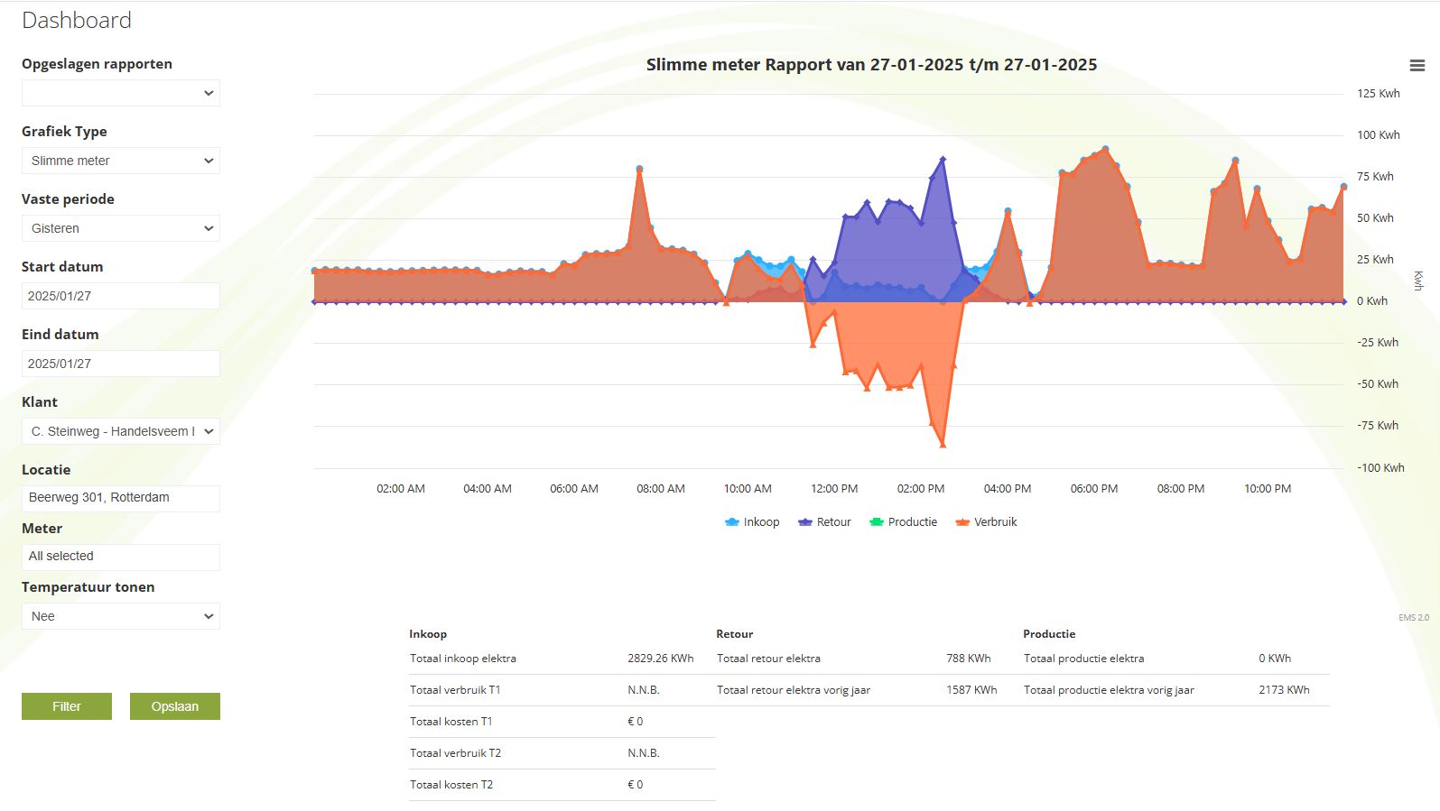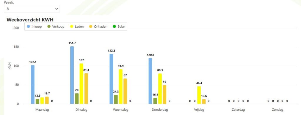 Deze EMS geeft per dag inzake in al uw energiestromen. Hierboven ziet u uw dagelijkse verbruik, inkoop energie, opgewekte energie en welke rol de Powerbank pro heeft in het terugbrengen van uw energierekening.